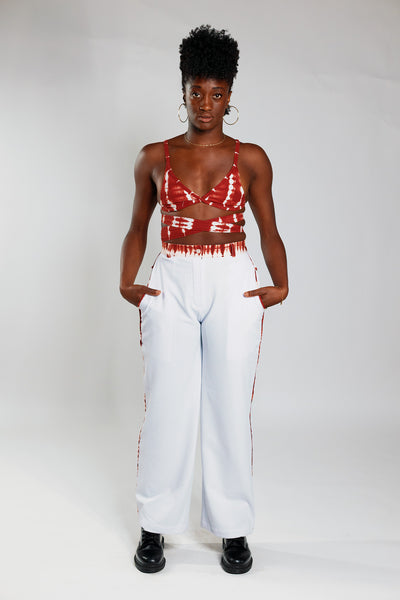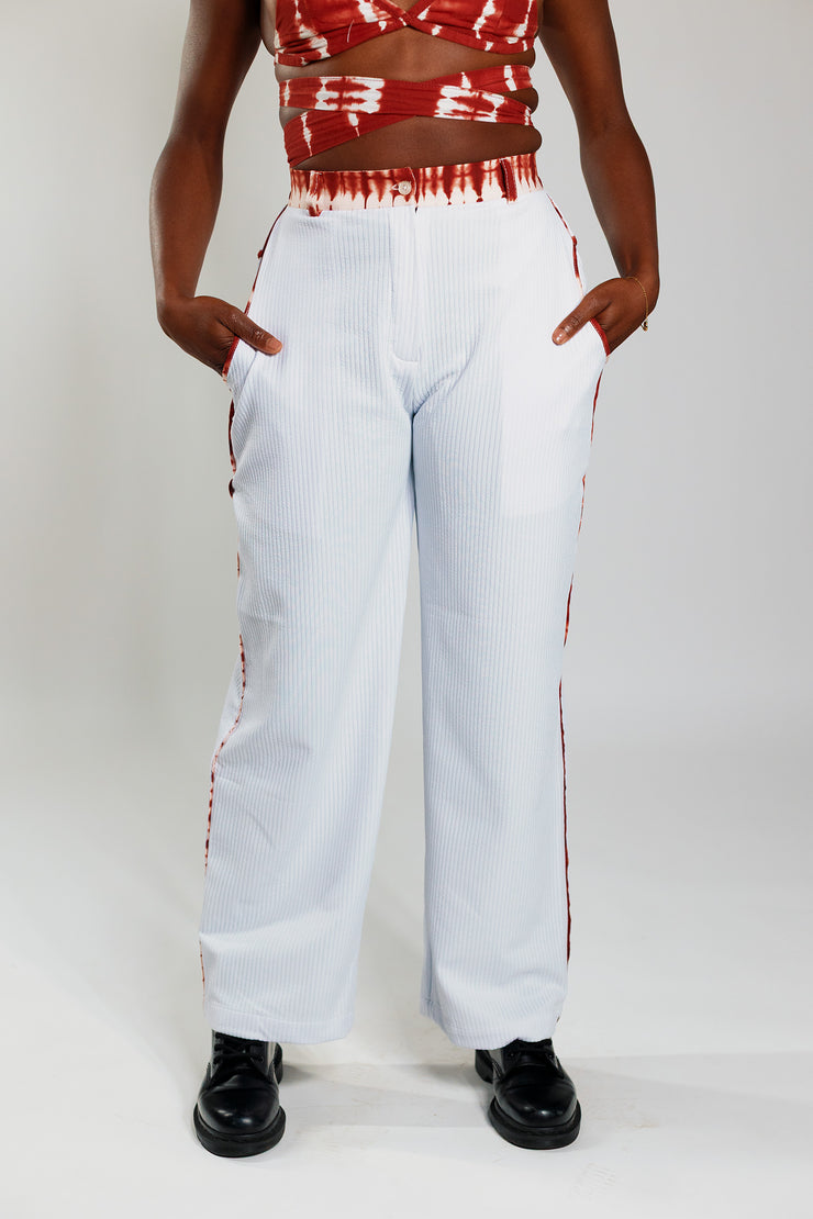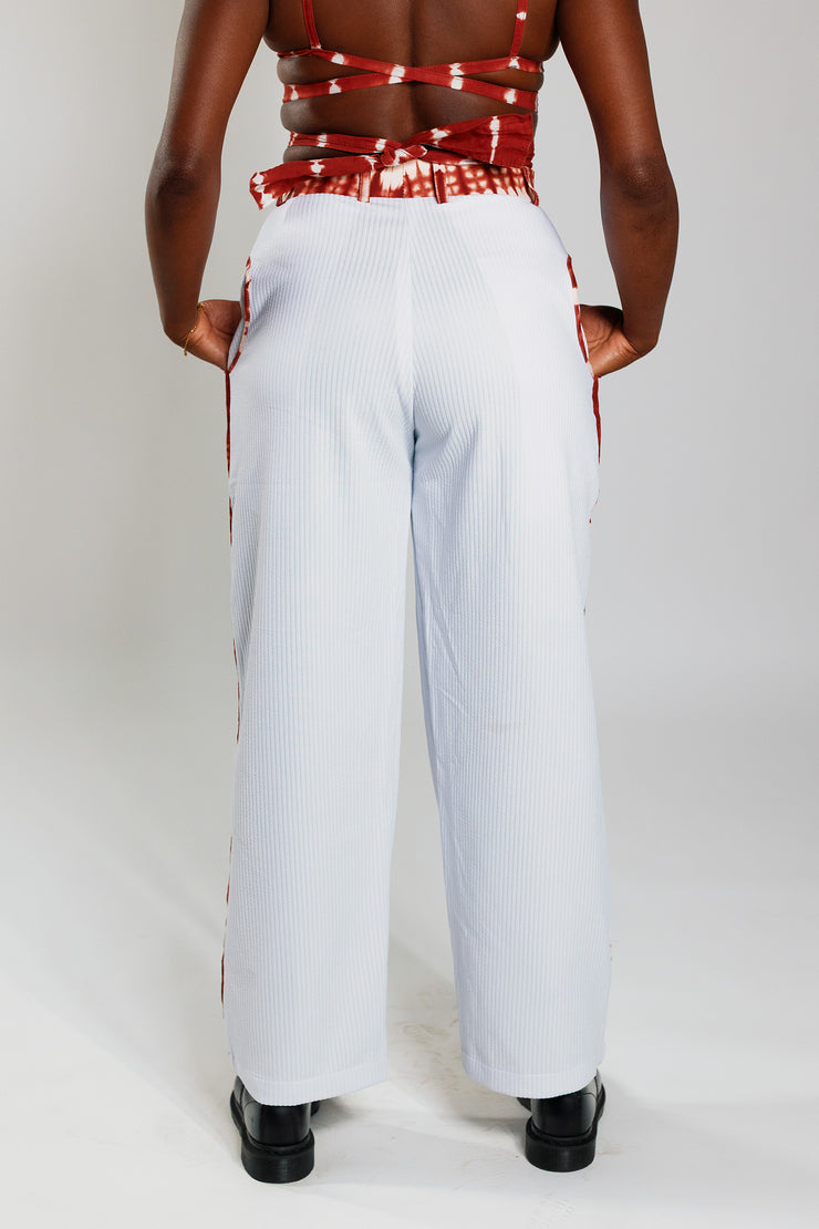 Color with depth. Shape with flow. The Flared Trousers in White Rib and Deep Red are a bold blend of structure and movement. Handcrafted in Ghana, this style features a flared leg cut, a strong silhouette, and a two-tone finish — combining premium ribbed synthetic fabric with richly hand-dyed 100% cotton in deep red. A confident piece that moves with intention and speaks in color.
