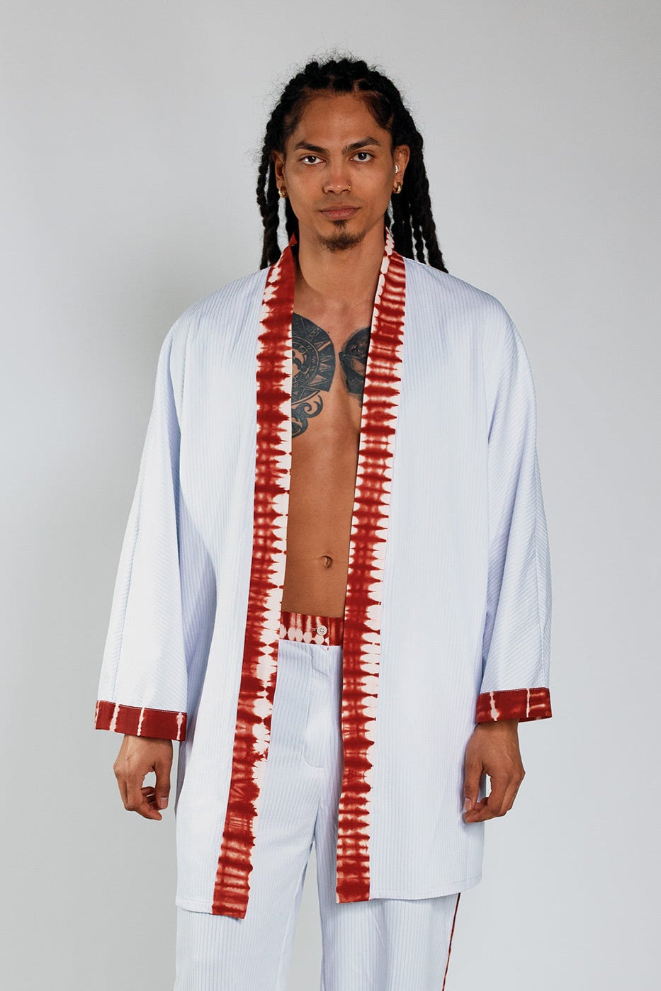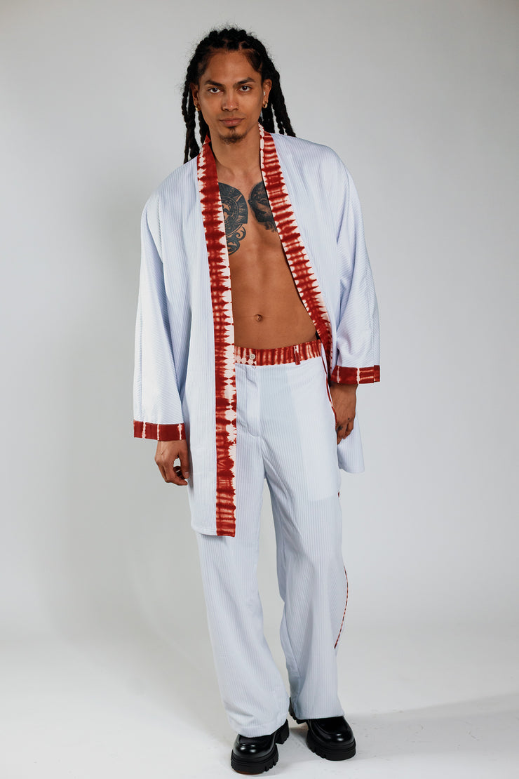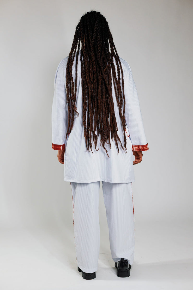 Wrap yourself in bold contrast and craft. The Kimono in White Rib and Deep Red is a flowing outer layer made for movement, expression, and edge. This piece features structured white ribbed synthetic fabric and deep red hand-dyed 100% cotton, crafted by hand in Ghana. The oversized sleeves, open front, and weighty texture make it a standout layering piece with both softness and presence.