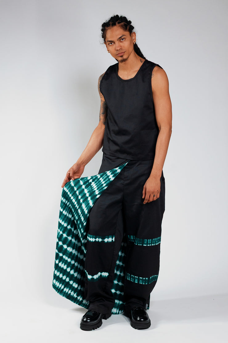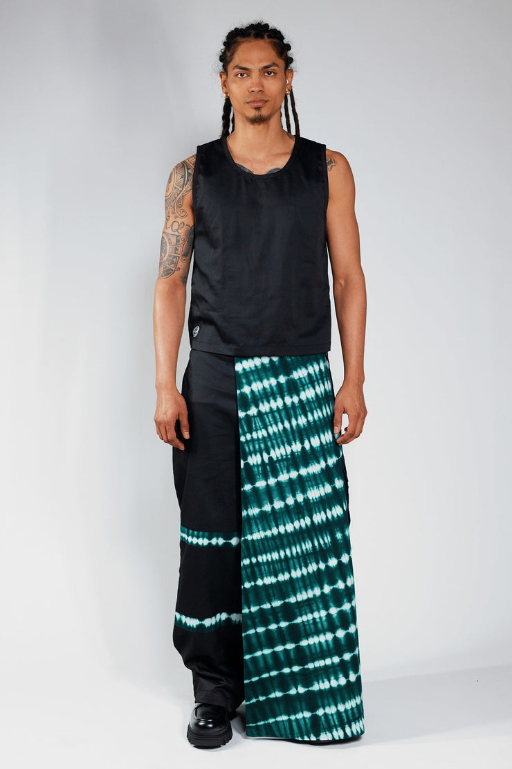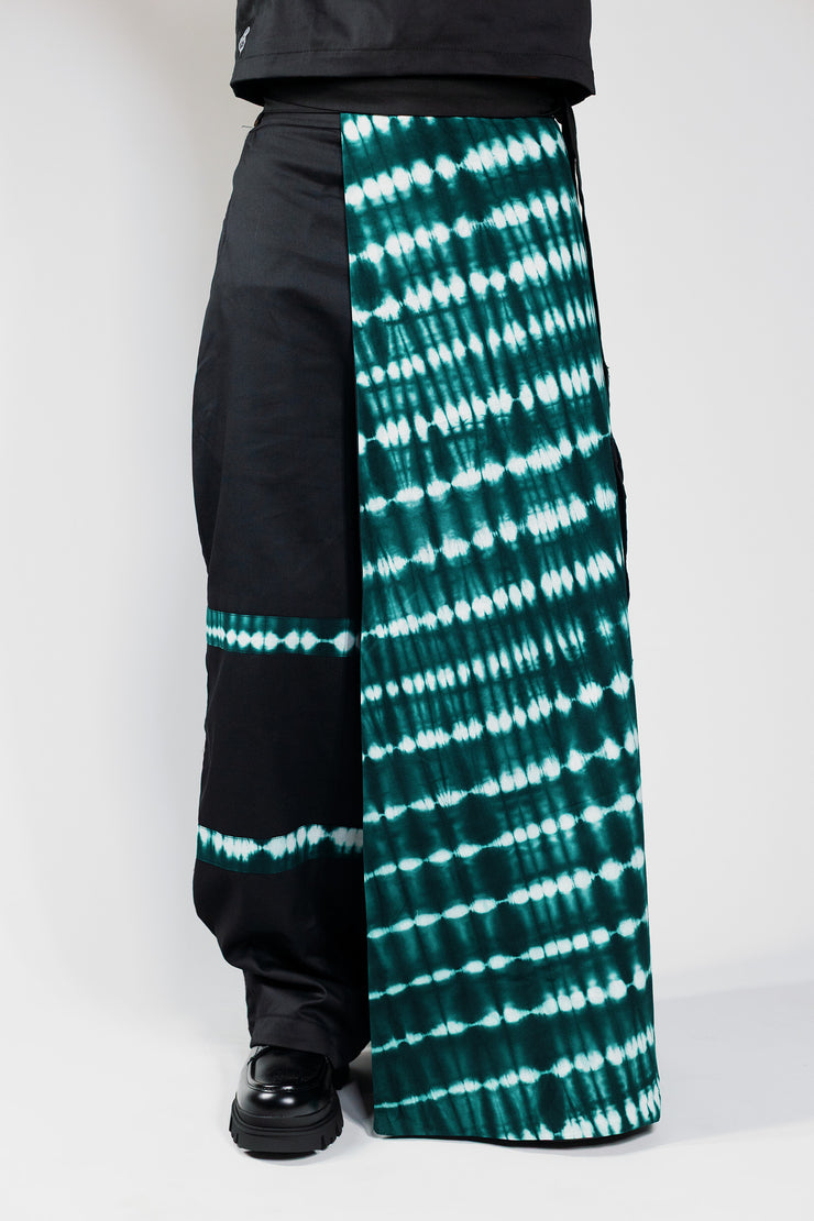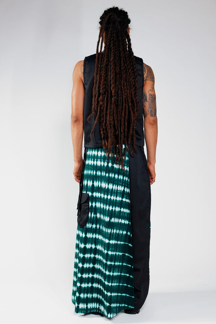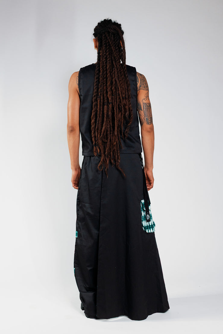 Not just an accessory — a statement. The Reversible Cargo Halfskirt in Cargo Black and Deep Green is designed for movement, layering, and expression. Handcrafted in Ghana from 100% premium cotton, this piece partially wraps around the body and ties with extra-long straps for an adjustable fit. One side shows a structured black cargo fabric; the other reveals a hand-dyed deep green tone — bold, earthy, and made to mix.