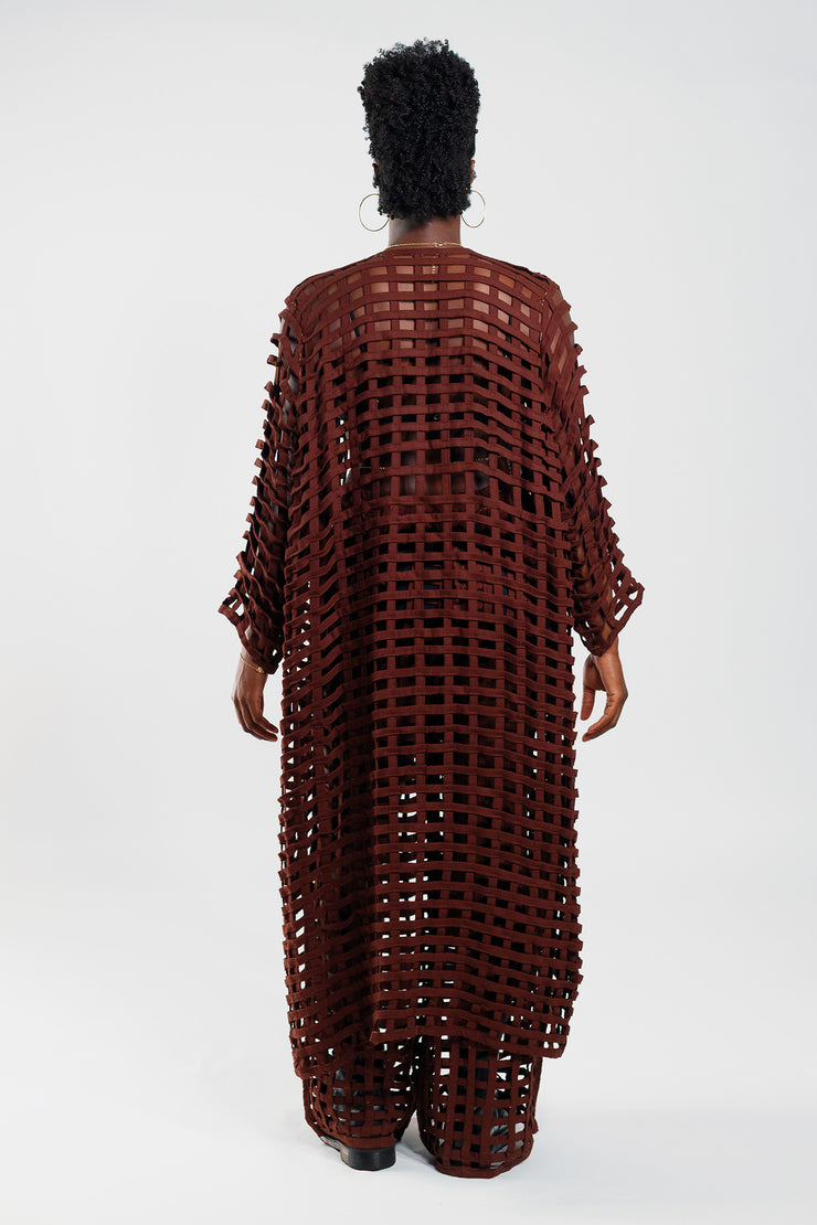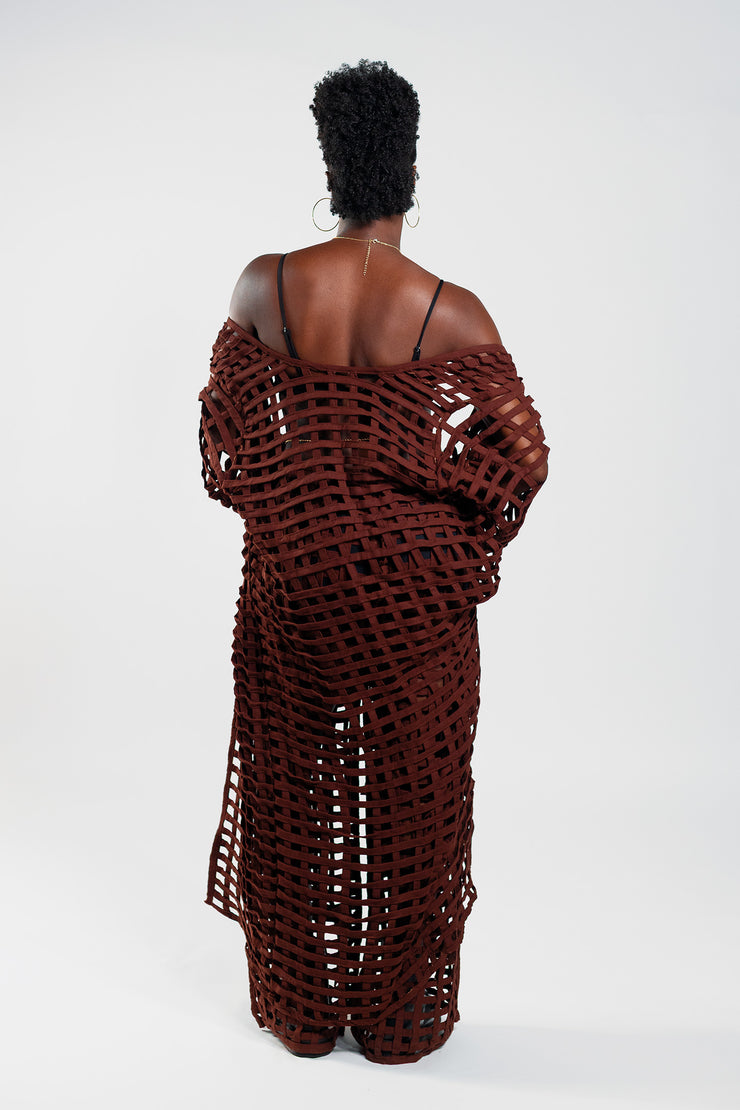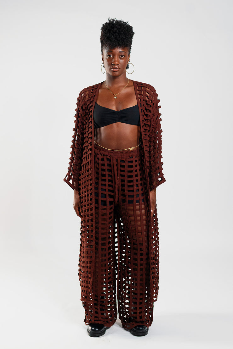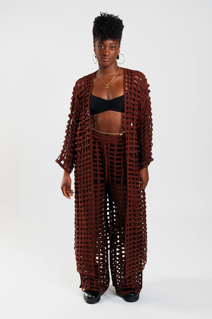 Sheer weight. Full presence. The Wide Sleeve Basket Kimono in Basket Brown is a structured, see-through statement piece — designed for bold layering and rhythm-ready movement. Crafted from heavyweight netted 100% cotton, it drapes with intention, flows with gravity, and brings real impact to your silhouette. Handmade in Ghana, this piece commands attention without saying a word — the signature outer layer of the SS25 collection.